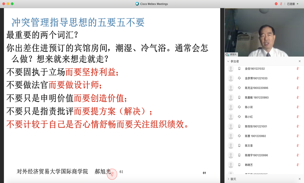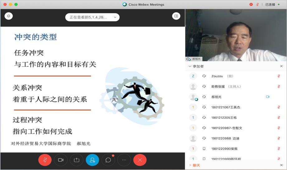 同学们对郝教授这种理论与实践结合、逻辑严密而又生动灵活、保证内容与注重激荡智慧的讲课方式给予高度评价。“我们太喜欢了”,有同学留言。讲座的最后,同学们就如何处理与同事和上司的冲突等问题与郝教授进行了交流探讨,并通过视频和文字互动的方式表达了对郝教授的感谢,讲座在热烈的气氛中结束。