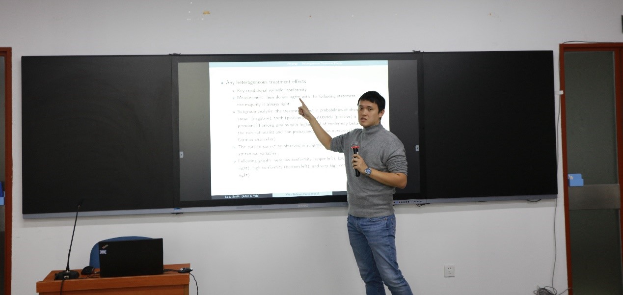 11月26日,学院组织的“青年学者论文工作坊”第五期活动在廖凯原楼514教室举行。博士后陆风鸣老师主讲题为“Who Believes Government Propaganda? Experience Evidence from China”的在研论文。刘颜俊、马啸两位老师担任评议人。曾渝、孙明、费海汀、周强、淦宇杰等老师,20余位在读硕士博士研究生及来自其他院校的教师参加了此次工作坊。张长东老师主持本期工作坊。