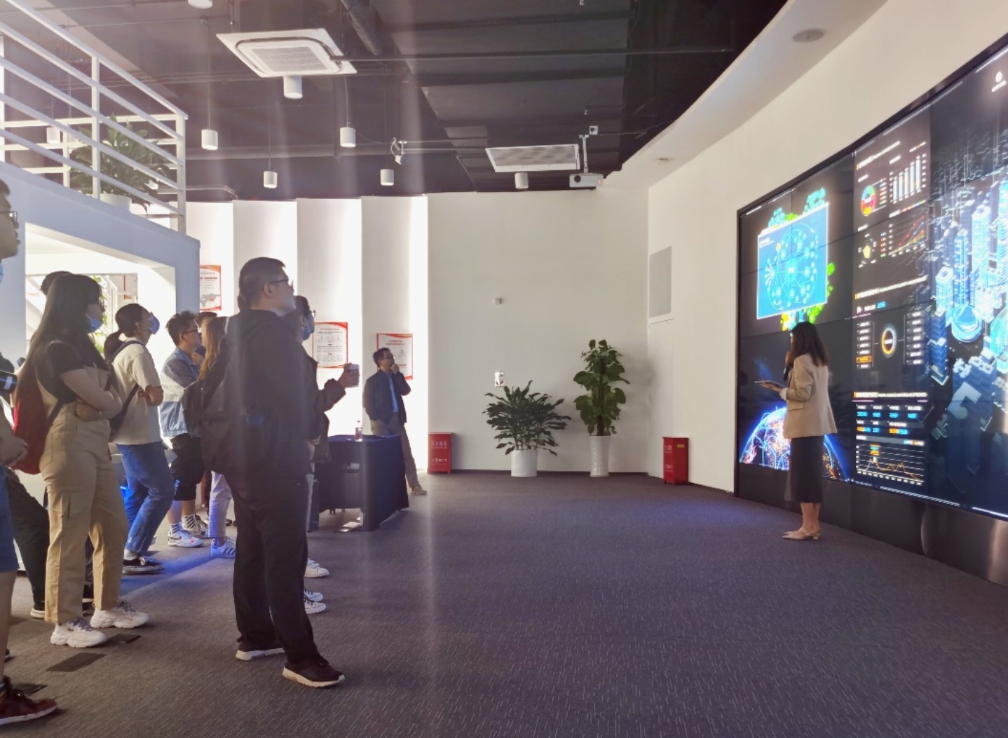 第二项活动在时尚酷炫的公司业务展厅展开。在干活满满的大幅高清LED屏幕前,师生们借助可视化的界面操作和翔实的案例分享,生动地了解到数据智能技术助力政府治理现代化的各类场景和应用效果。同学们认识到,数字技术必须嵌入到的特定场景中才能发挥实际价值。立体化的成果展示拓宽了同学们对技术应用场景的认知视野,为今后的学习及研究提供了新思路。