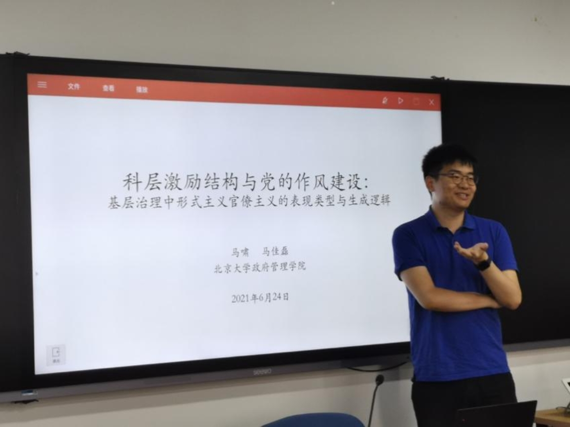 北京大学政府管理学院助理教授马啸以“科层激励结构与党的作风建设:基层治理中形式主义官僚主义的表现类型与逻辑”为题作了专题发言。中共在不同的历史时期都开展了针对形式主义官僚主义现象的斗争,积累了丰富的实践经验,但学术界对于形式主义官僚主义现象的成因探索相对较少,更多的是把形式主义官僚主义产生的原因归咎于党员干部个人理想信念的缺乏,但对于导致形式主义官僚主义的体制机制方面的深层因素探索还相对不足。对于任何大型组织而言,形式主义官僚主义都是必然存在的。影响官员行为的组织激励因素可以分为两个维度:一是考核指标的清晰化程度,二是激励方向。在这两个维度的作用下,会产生“不执行”、“表演式执行”、“过度执行”和积极执行四种类型的官员行为。如果上级组织制定的考核指标清晰化程度较低,激励方向是负面的,下级官员就很容易出现形式主义官僚主义的行为。