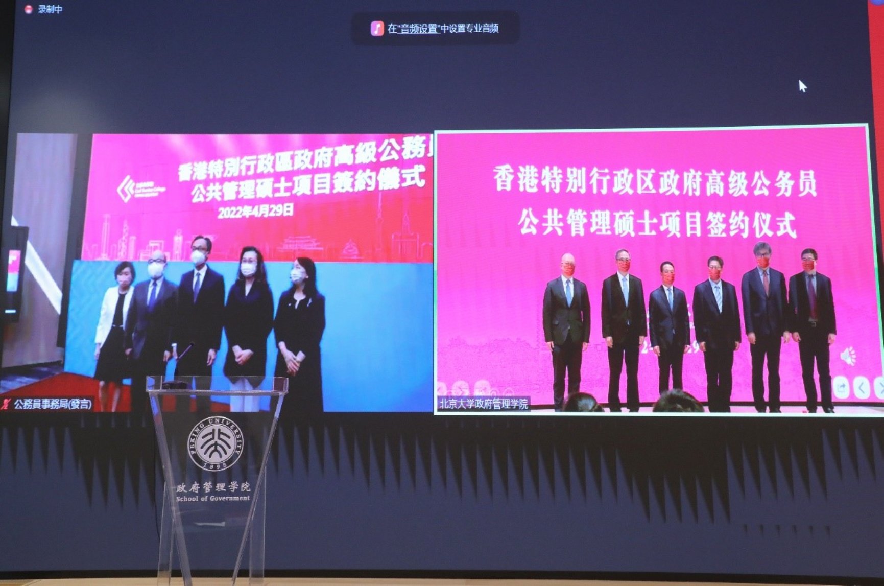 2022年4月29日上午,香港特区政府高级公务员公共管理硕士项目签约仪式在北京大学政府管理学院廖凯原楼342室举行。国务院港澳事务办公室副主任黄柳权、联络司司长陈继光,北京大学党委书记邱水平、副校长王博、港澳台办公室副主任李昀、政府管理学院院长燕继荣、党委书记李海燕和学院党委行政班子成员出席仪式。香港特别行政区公务员事务局局长聂德权,常任秘书长、公务员学院院长杨何蓓茵,副秘书长潘伟荣,首席助理秘书长赖雪芬,助理首席训练主任谭咏堃在香港会场连线出席仪式。签约仪式由北京大学研究生院副院长王天兵主持。