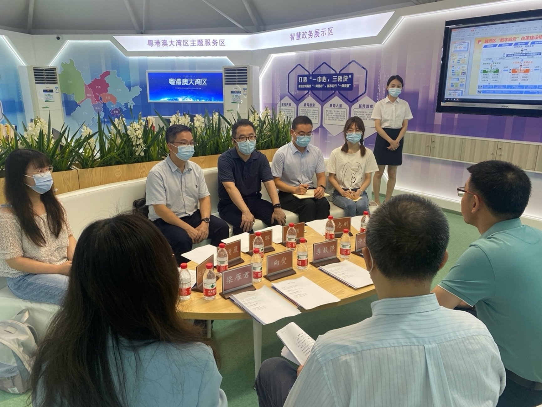 7月7日下午,调研组一行到访广州市越秀区政务服务数据管理局,双方就广州市越秀区一网通办、一网统管和一网协同建设情况展开交流座谈。越秀区政数局局长李毅强、副局长向燮、政务服务科科长许剑辉、越秀区电子政务办副主任梁雁君、广东省人民政府发展研究中心刘春晖出席座谈会。