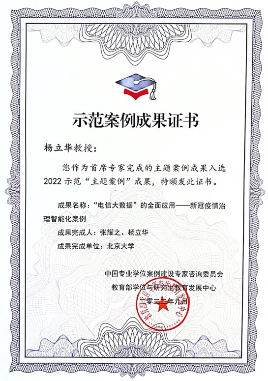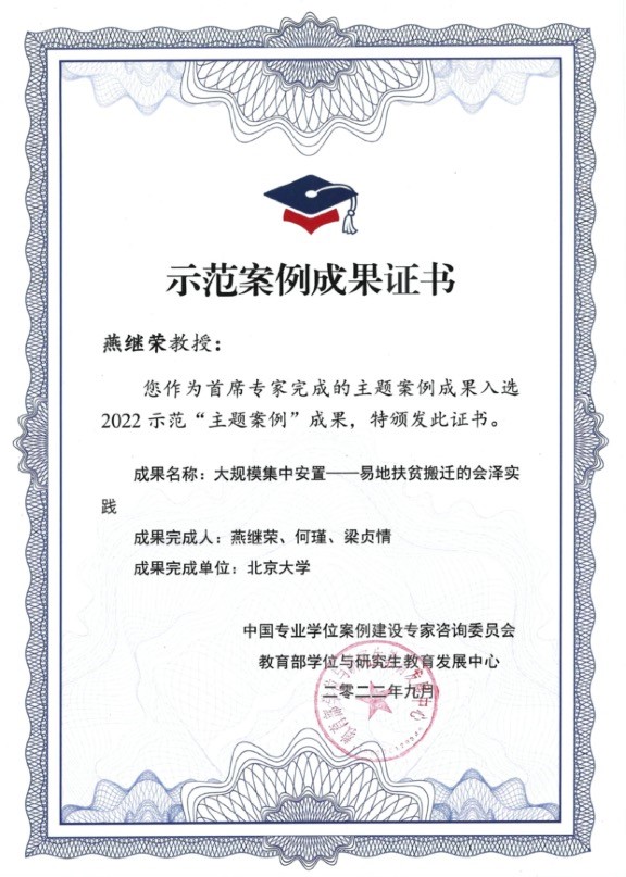 政府管理学院燕继荣教授和杨立华教授分别担任首席专家的案例作品《大规模集中安置——易地扶贫搬迁的会泽实践》和《“电信大数据”的全面应用——新冠疫情治理智能化案例》获评示范“主题案例”,被收录至中国专业学位案例中心精品案例库、并被汇编至《首届中国案例建设国际研讨会(2022)示范“主题案例”成果集》。