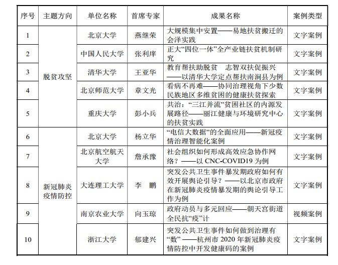 两项案例作品分别聚焦“脱贫攻坚”和“疫情防控”主题,从实践中提炼中国故事、中国方案,回应国家治理体系和治理能力现代化中的重要议题,对于推动具有中国特色、中国风格、中国气派的案例研究及发表工作,推动具有时代性、学理性、价值性的案例进课件、进教材、进课堂具有重要意义。