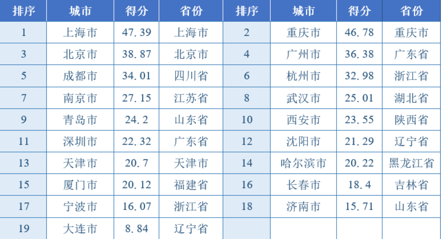 副省级及以上城市综合得分排名