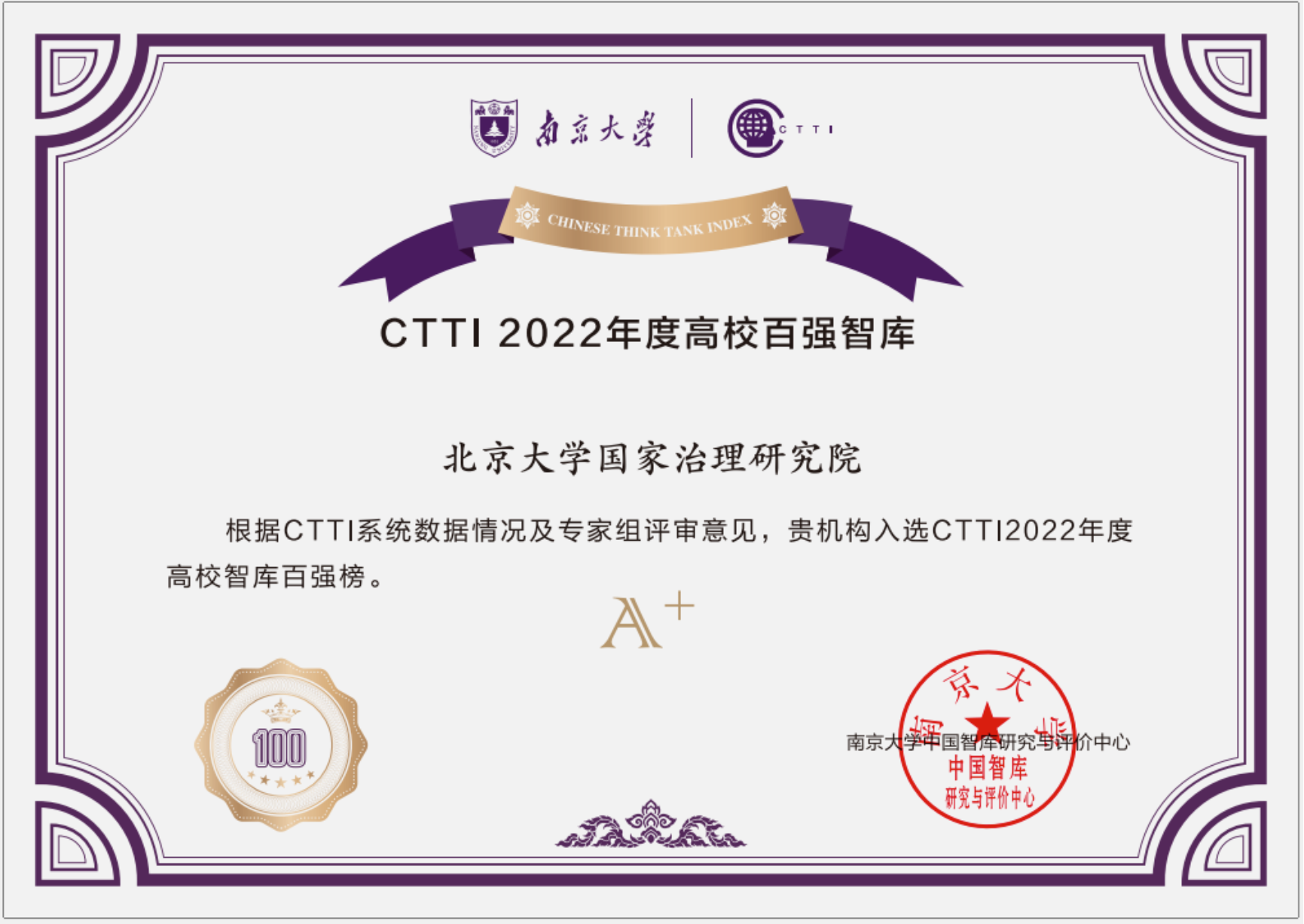 2022年12月,在CTTI2022高校智库百强榜评选中,北京大学国家治理研究院入围百强,被评为A+等级。