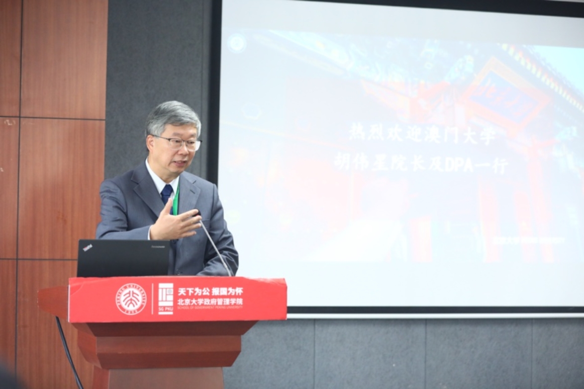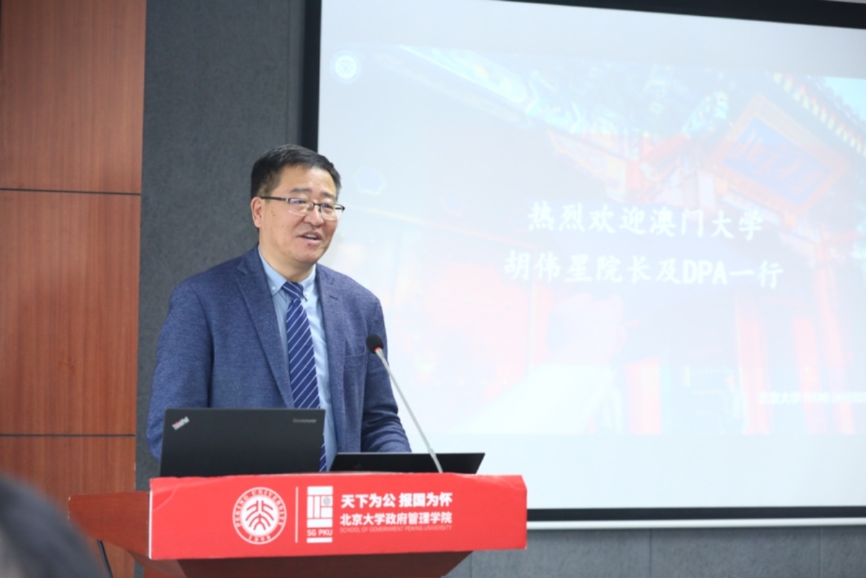 燕继荣院长对澳门大学访学团的到来表示热烈欢迎,并介绍北京大学政府管理学院的历史背景、办学理念、学科建设等基本情况。燕继荣院长表示,希望通过此次访问,双方不仅能够互相交流关于良政善治的理念,对于经济发展、国家治理、社会治理、全球治理的认识,而且能够增进友谊、促进合作。