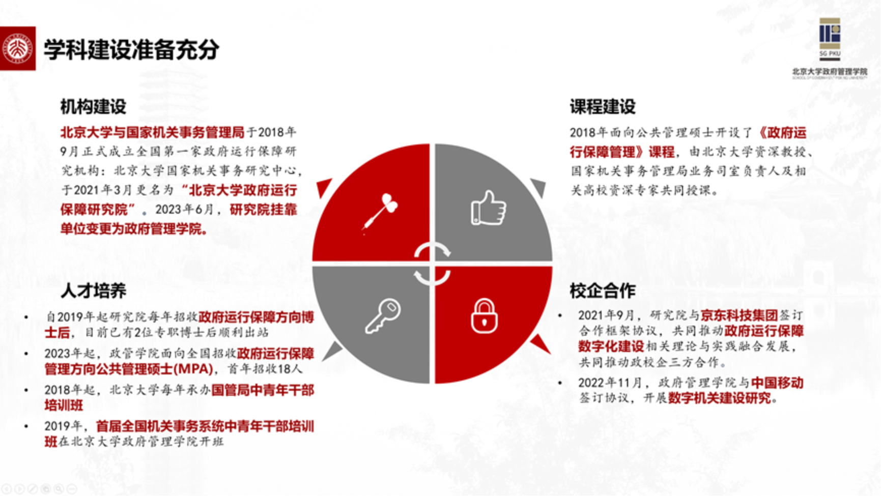 北京大学是全国最早开展政府运行保障管理研究与教学的先行示范高校之一。2018年,北京大学与国家机关事务管理局成立了全国第一家政府运行保障管理研究机构“北京大学政府运行保障研究院”。近年来,依托政府管理学院和研究院,北京大学在相关领域的学术研究、人才培养和社会服务等方面做了大量工作,完成了《机关事务治理法治化研究》《政府治理体系和治理能力现代化视角下的机关事务工作研究》《机关运行保障数字化研究》等重要课题;在《中国行政管理》《中国机关后勤》等学术期刊发表了系列研究成果;组织编写并出版了《机关事务管理与法治政府论丛》;率先面向公共管理硕士(MPA)开设《政府运行保障管理》课程;举办“全国机关事务研究中心建设”“数字机关建设”等专题研讨会以及全国机关事务管理系统中青年培训班,取得丰硕成果。从2023年起,政府管理学院每年面向全国招收政府运行保障管理方向公共管理硕士(MPA)40人,2024年在行政管理专业招收政府运行保障管理方向博士生2名,为全国党政机关及相关行业培养政府运行保障管理方向的专业人才。