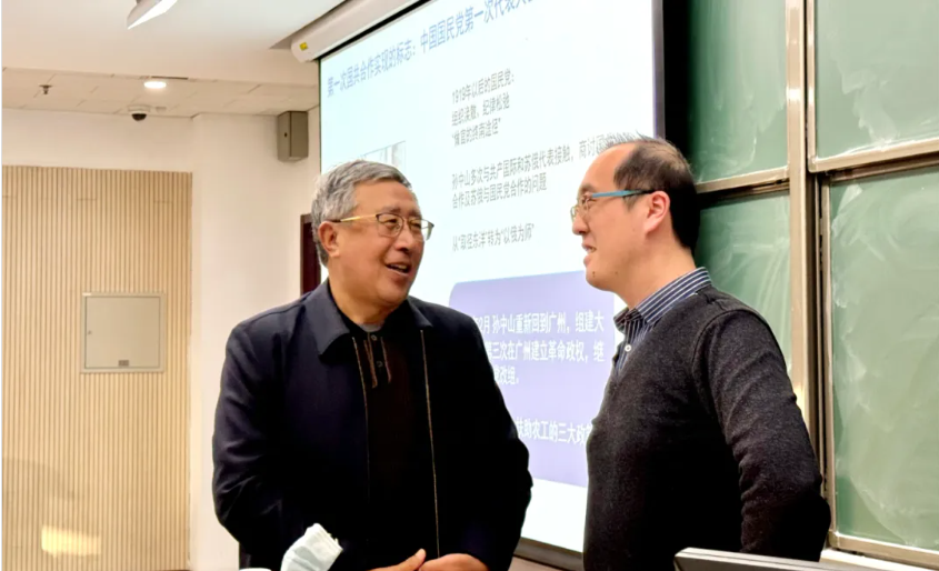 课间和课后,关海庭来到讲台前,两人对课程展示的环节设置安排等问题进行讨论,他还对如何发挥学生的主体性、使学生能够充分展示自己所学提出了一些自己建议;同时,他也认为裴植老师对于经济基础问题的分析“非常精彩”,而能够在知识讲授中贯穿自己的历史观和学术思路,这也是关海庭十分认同的。