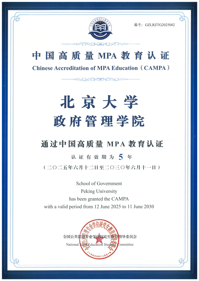2025年6月18日,全国公共管理专业学位研究生教育指导委员会发布《关于首批试点单位通过中国高质量MPA教育认证(CAMPA)的通知》,作为首批六家试点单位之一,北京大学政府管理学院公共管理硕士(MPA)专业学位项目正式通过中国高质量MPA教育认证(CAMPA),认证有效期为五年(2025年6月12日至2030年6月11日)。
