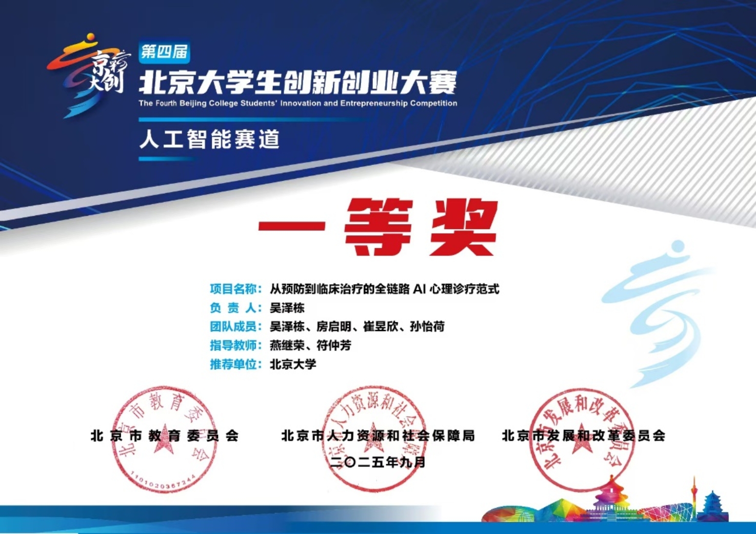 在北京市教委、市人力资源和社会保障局、市发展改革委联合主办的第四届“京彩大创”北京大学生创新创业大赛中,北京大学政府管理学院MPA学生吴泽栋领衔,房启明、崔昱欣、孙怡荷共同参与,在燕继荣、符仲芳两位老师指导下完成的项目《从预防到临床治疗的全链路AI心理诊疗范式》,经过层层选拔,最终荣获人工智能赛道一等奖。