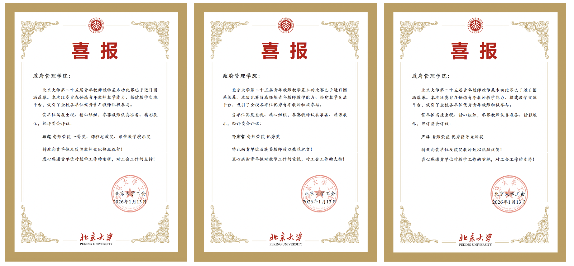 北京大学举办的第二十五届青年教师教学基本功比赛于近日圆满落幕,政府管理学院教师在此次比赛中再创佳绩。我院助理教授顾超荣获人文社科类一等奖;助理教授孙宏哲荣获优秀奖;副院长严洁教授荣获优秀指导老师奖。同时,顾超老师还获得课程思政奖、最佳教学演示奖。