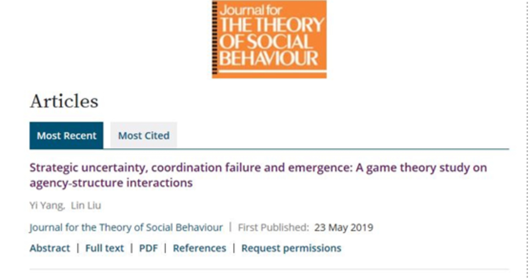 【最新发表】刘霖副教授和杨一助理教授在《Journal for the Theory of Social Behaviour》发表题为“Strategic uncertainty, coordination failure and emergence: A game theory study on agency‐structure interactions”的论文