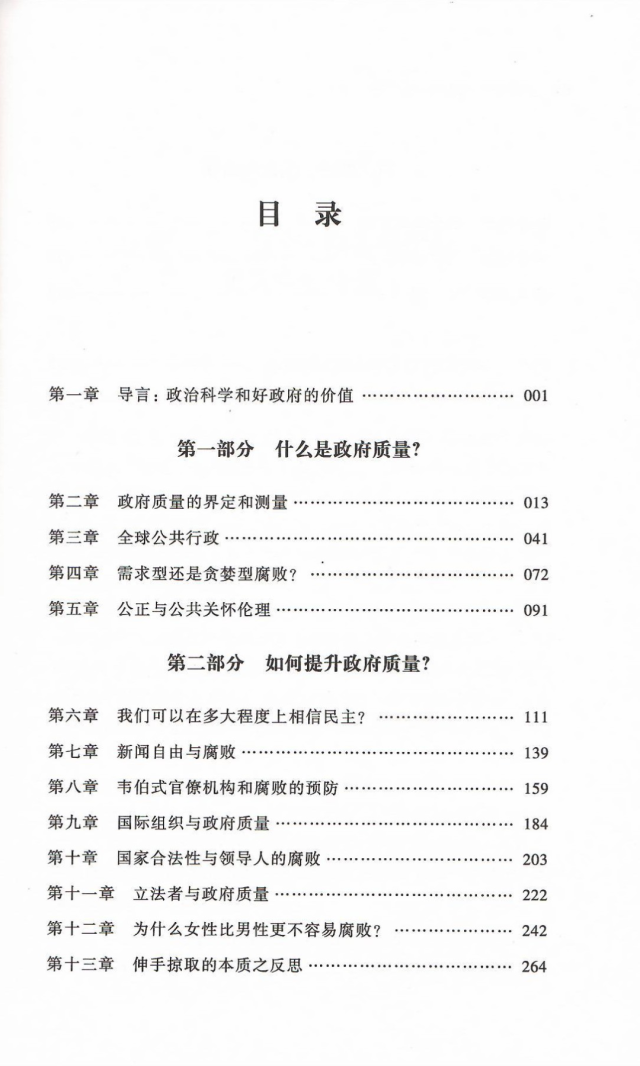 围绕这一主题,全书逐次展开了论述。首先,作者对于政府质量的一般理论进行了探讨;其次,作者围绕提升政府质量的途径展开分析,认为媒体、国际组织、行政组织的构造机理、立法机构、领导人的能力及政治取向等变量,都与政府质量相关。最后,作者论证了提升政府质量对于人类福祉的意义。