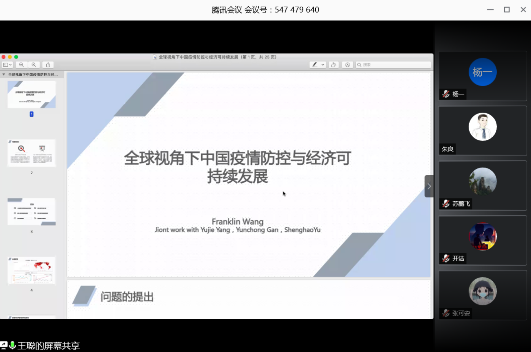 王聪同学探讨了中国疫情防控与经济可持续发展的关系,根据疫情-经济学理论的一般框架,构建了新的疫情-经济学理论模型,并从供给侧等角度提出了一系列政策建议。苏鹏飞同学针对主讲人分享的内容,从模型构建等角度进行了评议和讨论。