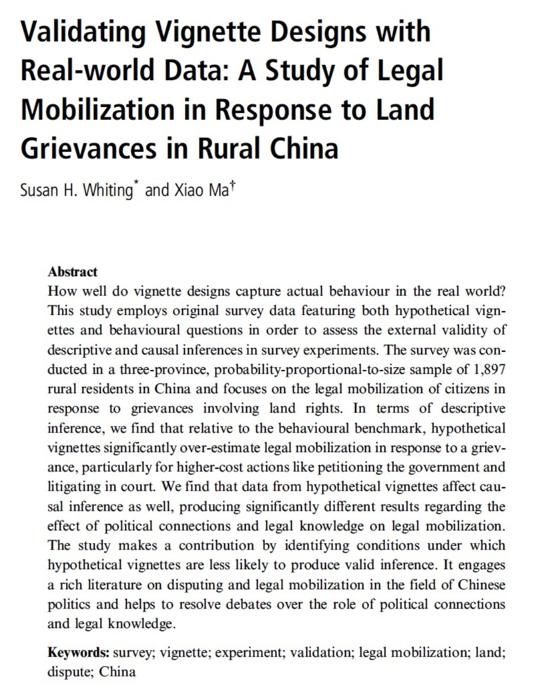 我院马啸助理教授与美国华盛顿大学政治学系白素珊(Susan H. Whiting)教授合作的论文Validating Vignette Designs with Real-world Data: A Study of Legal Mobilization in Response to Land Grievances in Rural China(用真实世界的数据检验情境设计:一项关于中国土地纠纷中法律动员的研究)近日于The China Quarterly(中国季刊)在线发表。