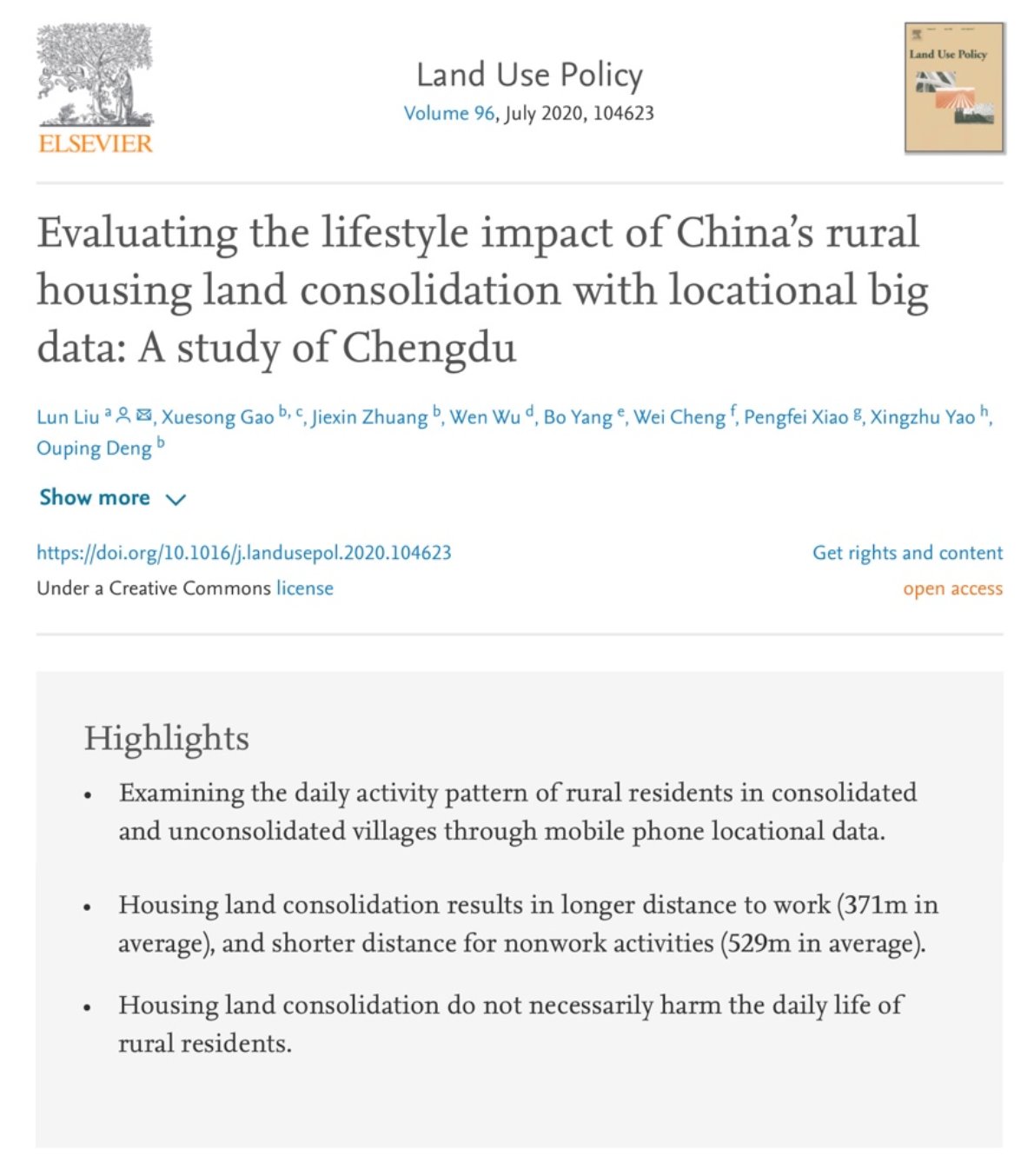 【青年学者专栏】刘伦助理教授在Land Use Policy发表论文:“评估中国农村宅基地整理政策对农民生活模式的影响:基于成都的研究”