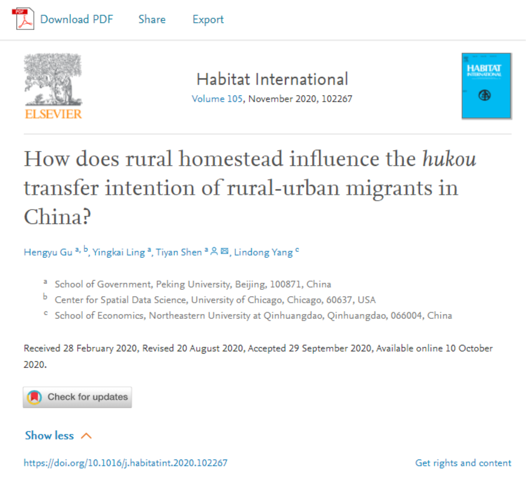沈体雁教授团队在Habitat International发表论文:“宅基地如何影响中国进城农业转移人口的户籍迁移倾向?”