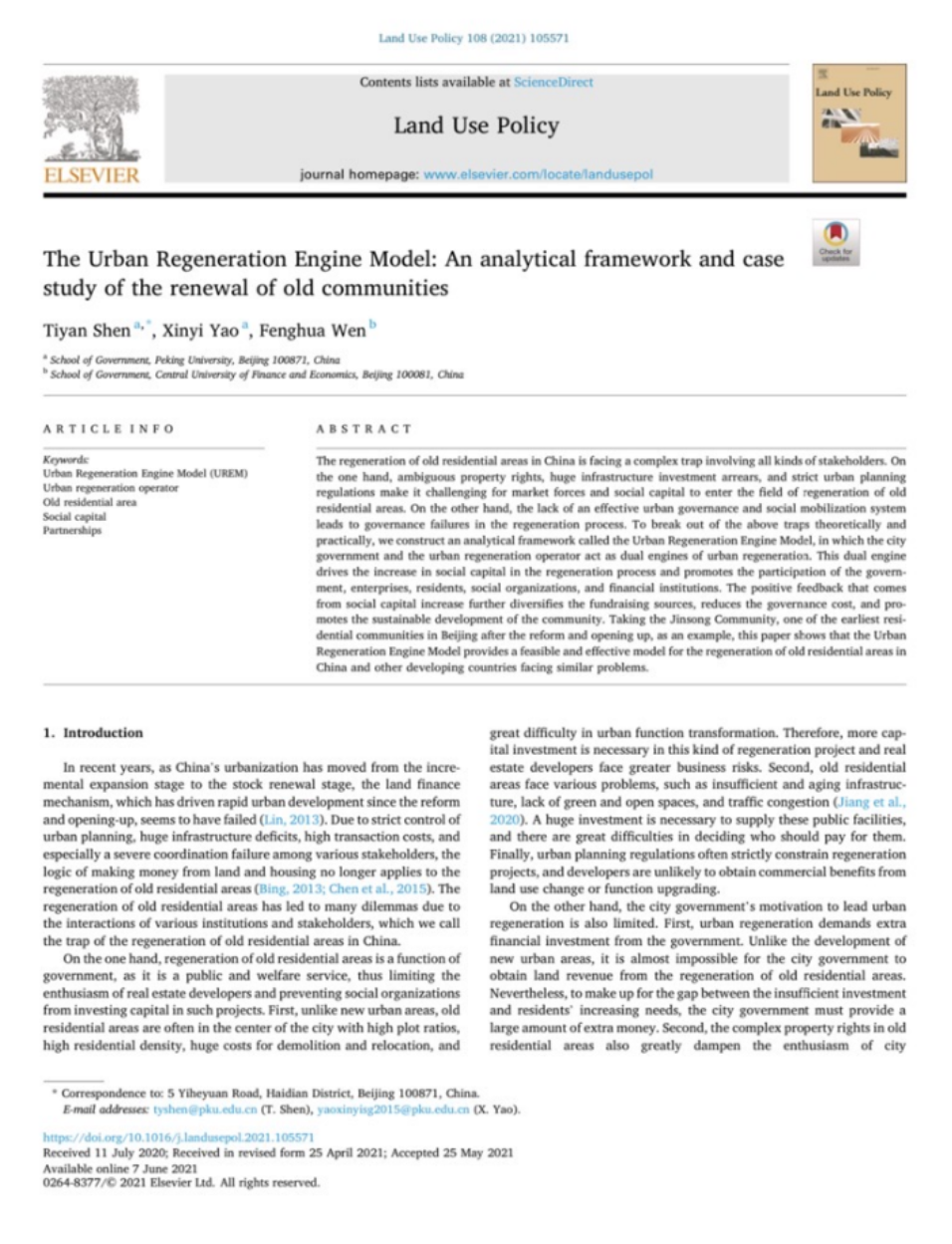 文献来源:Tiyan Shen, Xinyi Yao , Fenghua Wen (2021). The Urban Regeneration Engine Model: An analytical framework and case study of the renewal of old communities, Land Use Policy 108(6), https://doi.org/10.1016/j.landusepol.2021.105571.