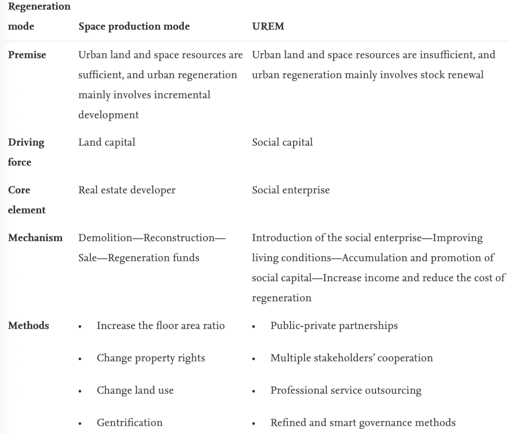 在以增量扩张为基础的快速城市化进程中,房地产开发长期被视为中国城市化的重点,土地资本被视为城市化的动力,但这一逻辑难以应用于中国的老旧小区改造。解决老旧小区更新困境的关键在于能否找到一种可持续的驱动力。基于此判断,论文提出了UREM模型,认为城市更新的驱动力是社会资本而不是土地资本。社会企业通过改善社区的环境、设施和服务,强化社区的整体功能和关系网络、积累和提升社会资本,为社区更新提供持续动力。这种双重引擎模式跟传统的土地开发模式在改造前提、驱动力、核心要素、改造机制、改造途径等方面均有根本的区别(表1)。