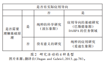 DARPA是美国以国家力量促进创新的主要标志。因此,Block把这种模式称之为“发展型网络国家”,Mazzucato称之为“企业家式的国家”,而Weiss则称之为“民族安全的国家”。这些称呼的不同反映了学者对于美国特点的各自理解,但同时都直指这种模式的国家性质。那么,美国为什么不依靠“万能的”市场机制而需要由国家设立的DARPA来领导创新?曾任DARPA领导人的Dugan和Gabriel回答了这个问题。他们将DARPA的工作性质解释为“巴斯德象限”的研究任务——具有应用导向的基础研究(见图2)。
