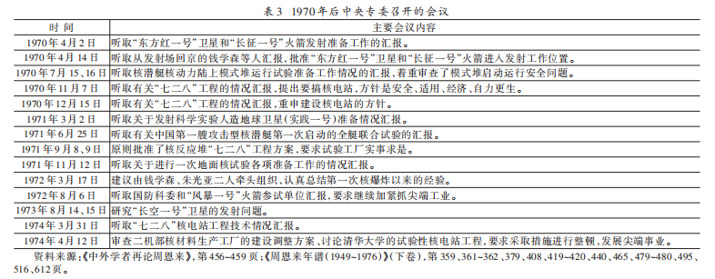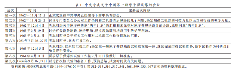 中央专委成立后,围绕原子弹研制的各项重大问题召开过多次专委会(见表1)。在专委的协调下,26个部委,20个省市、自治区,900多家工厂、科研机构、大专院校参加了攻关会战。原先在二机部和国防工业系统内无法解决的事情,中央专委直接联系相关部门和地方解决。例如,分离高浓度铀必须用到一种气体分离膜(“甲种分离膜”),科研攻关遇到很多困难;聂荣臻知道情况后,调集中国科学院上海冶金研究所、沈阳金属研究所、原子能研究所和冶金部的有关单位进行集中攻关,下“死命令”要求上海市领导必须完成任务,最终在1964年研制出符合技术要求的元件。后来钱学森回忆说:“那时中央专委的决定,要哪一个单位办一件什么事,那是没有二话的。那决定也很简单:中央专委哪次哪次会议,决定要你单位办什么什么,限什么时间完成……也不说为什么,这就是命令!中央专委的同志拿去,把领导找来,命令一宣读,那就得照办啊!好多协作都是这样办的,有时候铁路运输要车辆,一道命令,车就发出来了”。