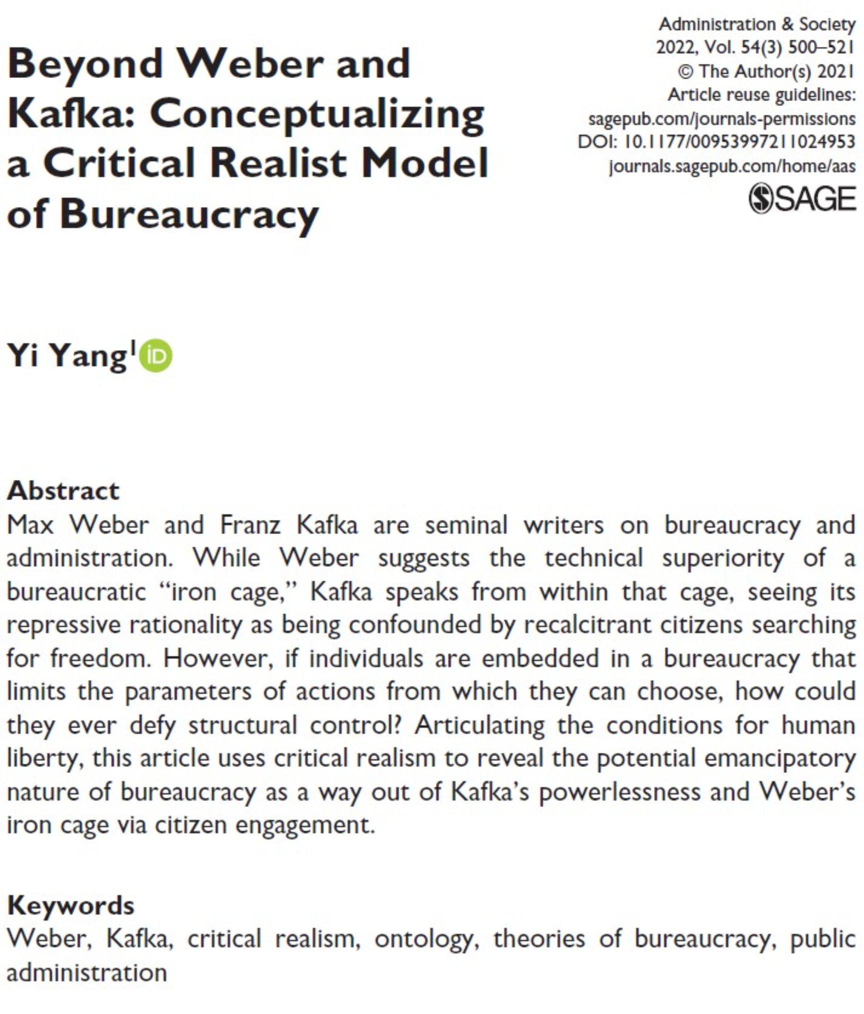 论文是一篇纯概念(conceptual)层面的理论探讨,通过批判实在论的哲学视角,修正了韦伯和卡夫卡式的行政(管理)理论。