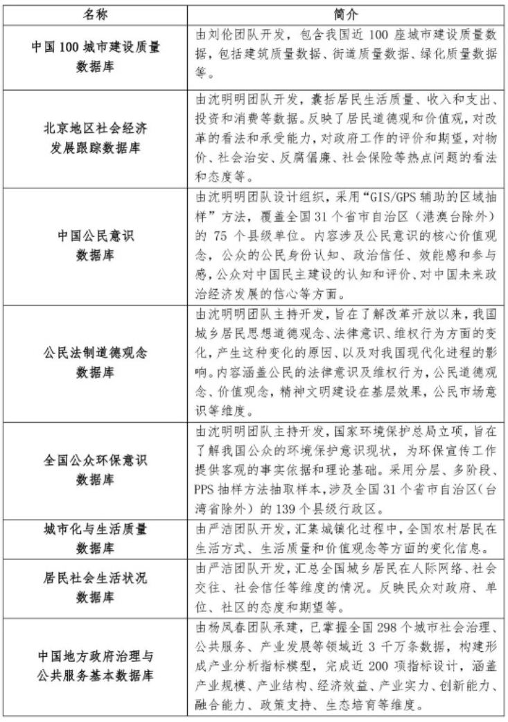 由俞可平团队负责,包括百余个创新项目实地追踪调查积累的大量一手资料,并完整收录了中国政府创新的各类科研文献资料。具有长时间段、大规模和多层次的特点,能够反映中国政府创新整体状况。