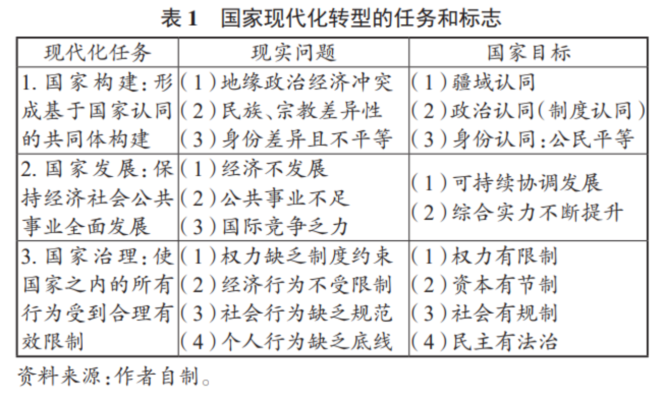 如上所述,“发展”与“治理”是任何国家的两大议题。它意味着,一个成功的国家,不仅要有可持续的发展态势,还要有良好的治理效果。比较现代化经验和理论研究显示,国家现代化转型有三个概念相当重要,即国家建构、国家发展和国家治理(如表1所示)。