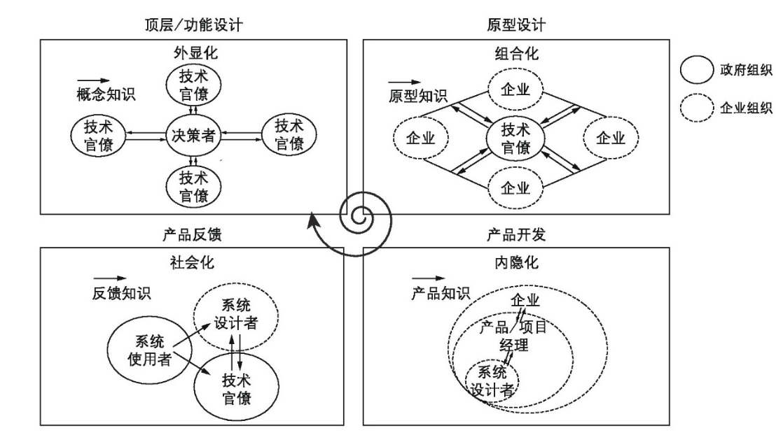 从知识管理的角度看,组织是知识的集成体。围绕政务信息化项目建设不同阶段,本研究将每一个阶段视作某一类知识的知识生产过程,同时采用了野中郁次郎和竹内弘高提出的SECI知识转化模型,该模型借鉴了波兰尼将知识划分为显性知识和隐性知识的方式,强调知识转化其实是显性知识和隐性知识互相转化过程。基于此,本研究提出从知识生产角度而言,政务信息化项目建设是四类知识(概念知识、原型知识、产品知识和反馈知识)的转化过程。理想情况下,上述四类知识相互转化,共同推进信息化项目建设。