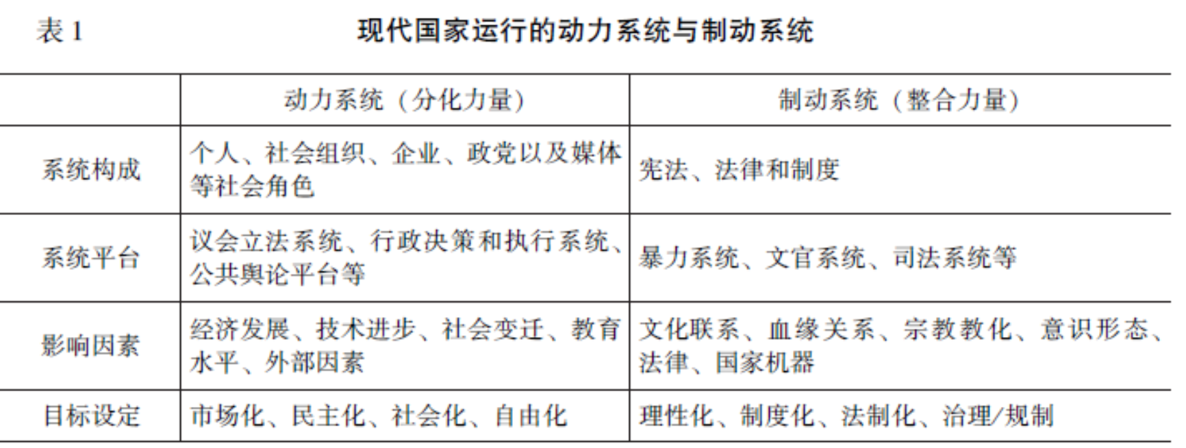 发展政治学的双重版本也要求研究者对政治发展做出双向的解读:从“动力系统”和“制动系统”两个角度理解国家发展。驾驭国家犹如驾驶汽车,汽车的行驶需要动力系统和制动系统的平衡。实际上,国家系统可以被看作由“动力系统”和“制动系统”两大系统构成的体系,它们分别对应着国家的发展和国家的治理。理想的国家治理需要满足“动力系统”和“制动系统”的适度平衡,既要保证国家的发展和进步具有持续的动力,又要保持路况基本良好,不至于“出轨”翻车。这种解读可以很好地解释中国如何在推进民主化、取得经济发展的同时, 维持社会的稳定和国家的长治久安。