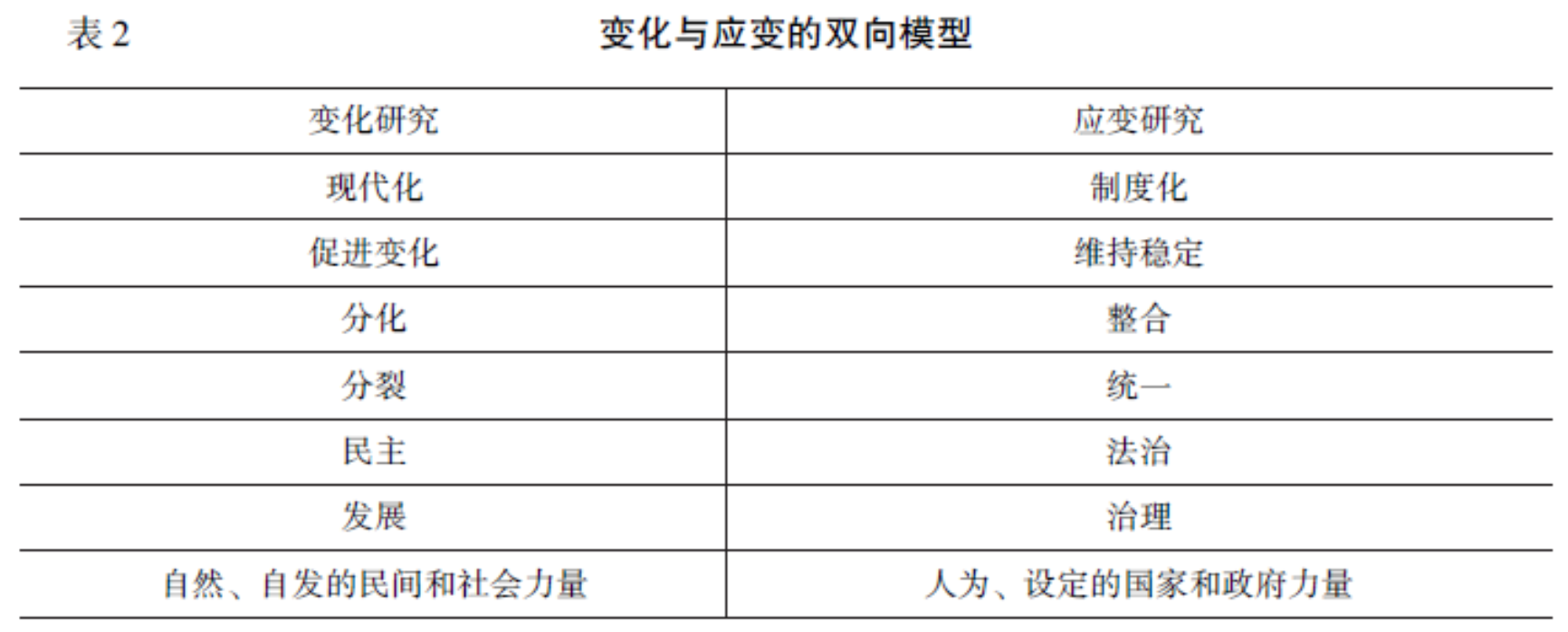 基于对发展政治学新的背景的认识、多重维度的把握、双重版本的辨别,可以构建出政治发展的新的模型(表2)。该模型主要包括变化和应变两个维度内容。发展意味着变化,现代国家的发展强调现代化和民主化,并且关注自然、自发的民间和社会力量,然而,这可能会导致分化和分裂,对社会秩序和政治稳定造成破坏。因此,国家需要运用人为、设定的国家和政府力量,通过制度化、法治、治理应对变化,实现整合和统一,维持社会秩序和政治稳定。未来的政治发展必须考虑到这两方面内容,这两者之间的互动直接影响到政治发展的成败以及质量。