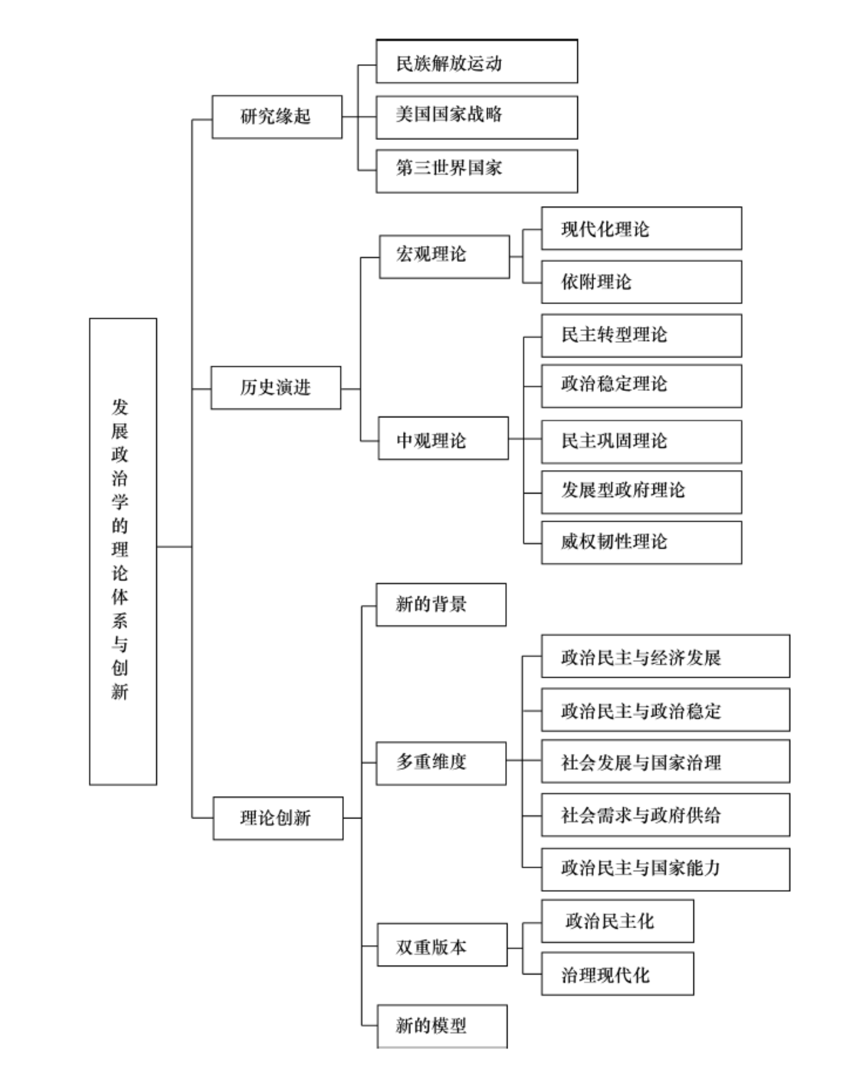 从研究缘起看,发展政治学主要是在民族解放运动的背景下兴起的。同时,美国国家战略以及第三世界国家的需要也为发展政治学的发展提供了动力。“二战” 结束后,亚非拉地区掀起了民族解放运动,大量的发展中国家走上了独立发展的道路,但他们依然面临着严重的发展问题,如工业化水平低、文化教育程度低、政治体制落后等。因此,如何实现经济起飞、社会转型和政治转轨, 如何从经济、社会和政治的不发达或欠发达状态过渡到发达状态,成为摆在发展中国家面前的关键议题。加之美国在“二战”后开始积极与世界各国进行接触,极力拉拢第三世界国家,并向其进行意识形态输出。在此背景下,大量西方社会、经济和政治理论家将注意力转移到发展中国家,开始普遍关注发展中国家的现代化和发展问题,试图通过促进物理、社会知识的增长推进发展中国家的社会、经济和政治变革,提高其经济生产效率、社会理性化水平和政治世俗化水平。其间涉及发展中国家“增长”“现代化”“进步”“发展”的研究都可以纳入发展研究的范畴。其中,发展政治学主要解释和说明政治体系变化的方向、条件和结果,探究政治现代化过程,并由此形成了各种理论和模型。发展政治学的研究大体可以分为:民主研究、政治发展与政治变革研究、政治发展的危机和结果研究三类。