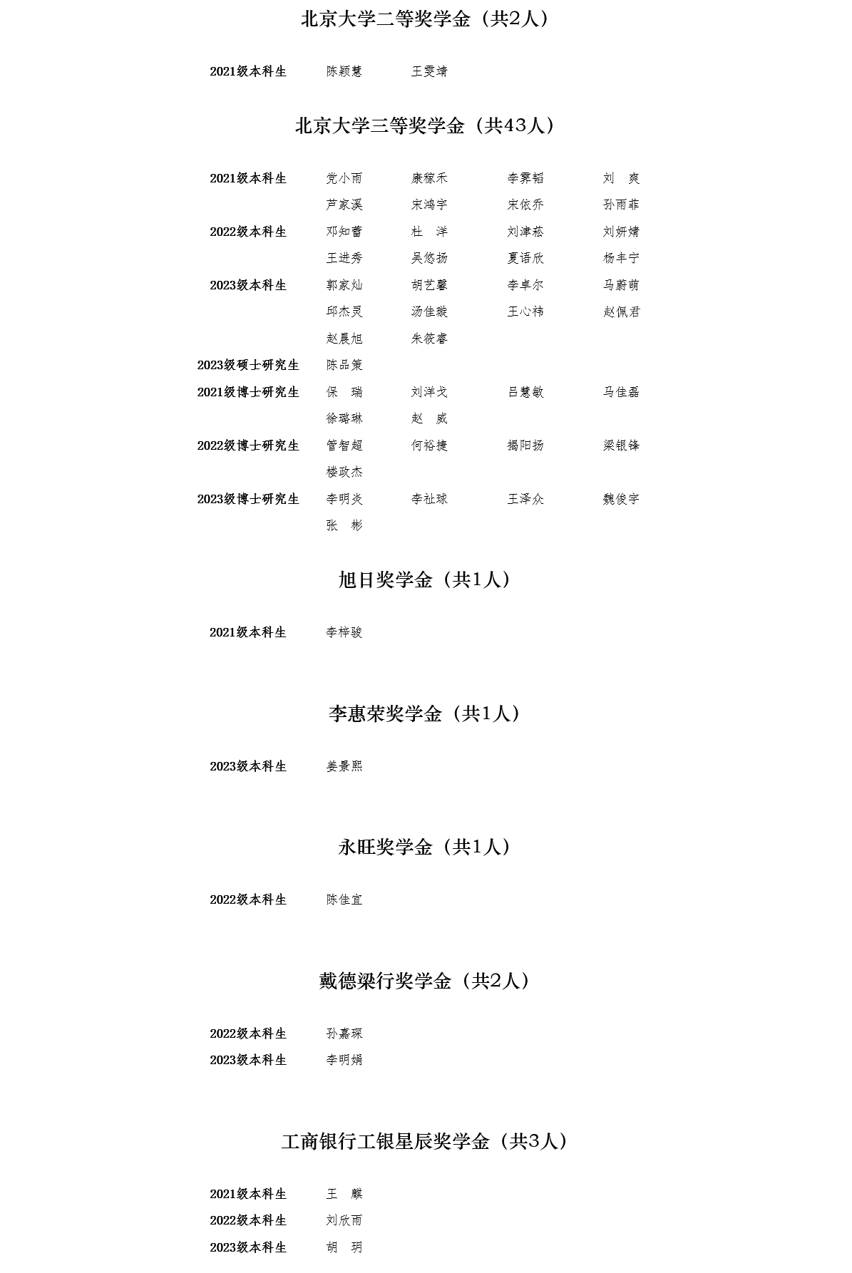 根据《北京大学奖学金评审办法》,学院各年级完成了 2023-2024学年度奖学金评选工作,现将名单公示如下: