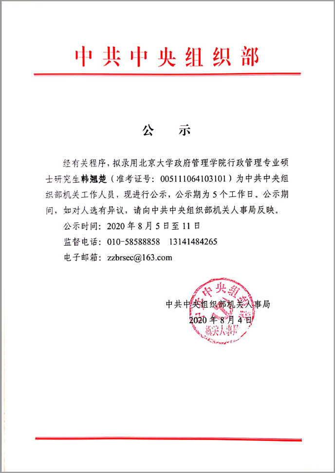 韩翘楚拟录用公示