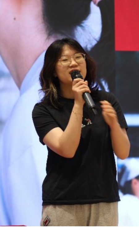剧本组组长金采介绍了剧本组的成员和剧本组进行创作的心路历程并向组员们的付出表达了感谢,此外她还结合微电影主人公的人设分享了自己对于“青春,从这里开始”这一主题的内涵和意义的理解与思考。