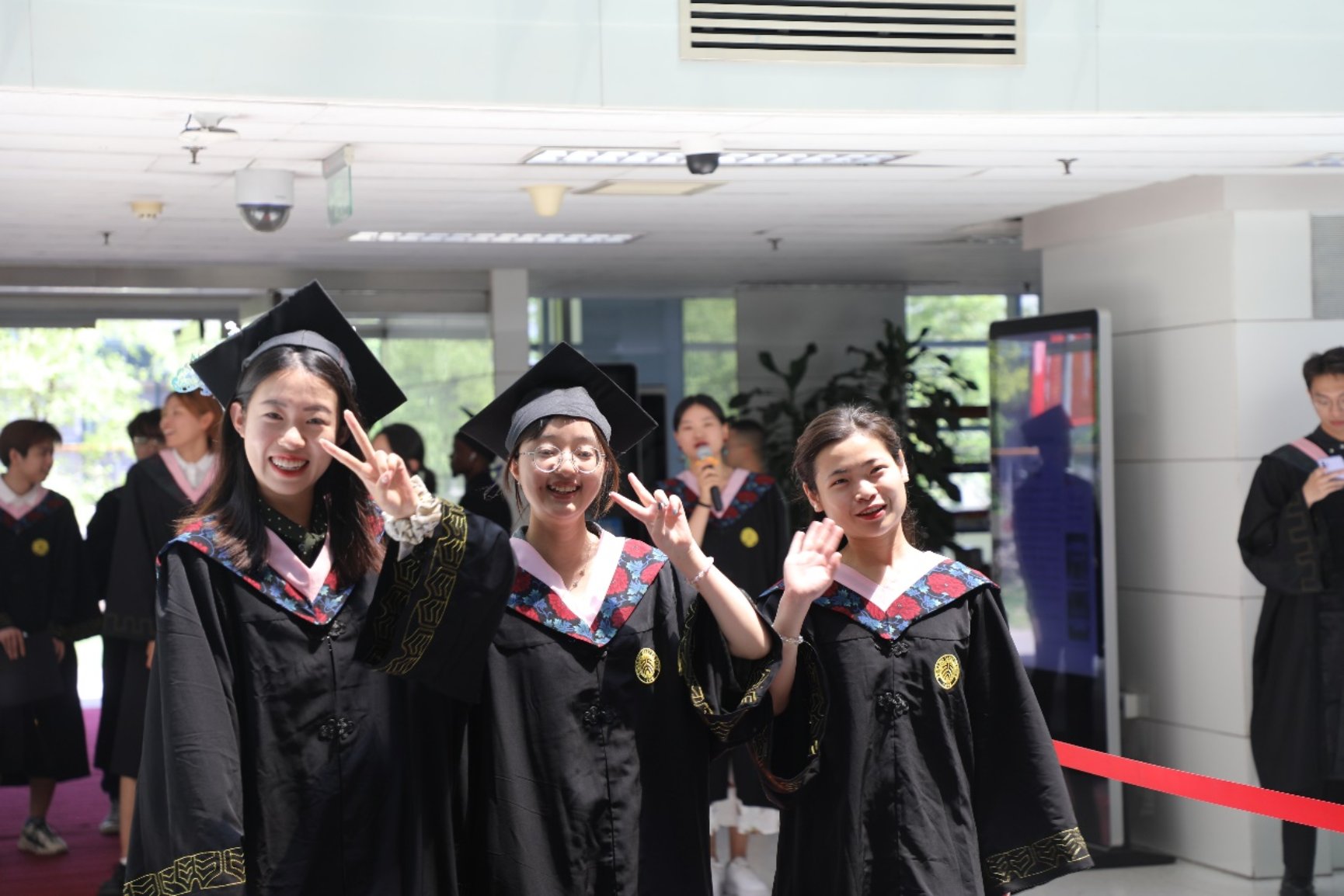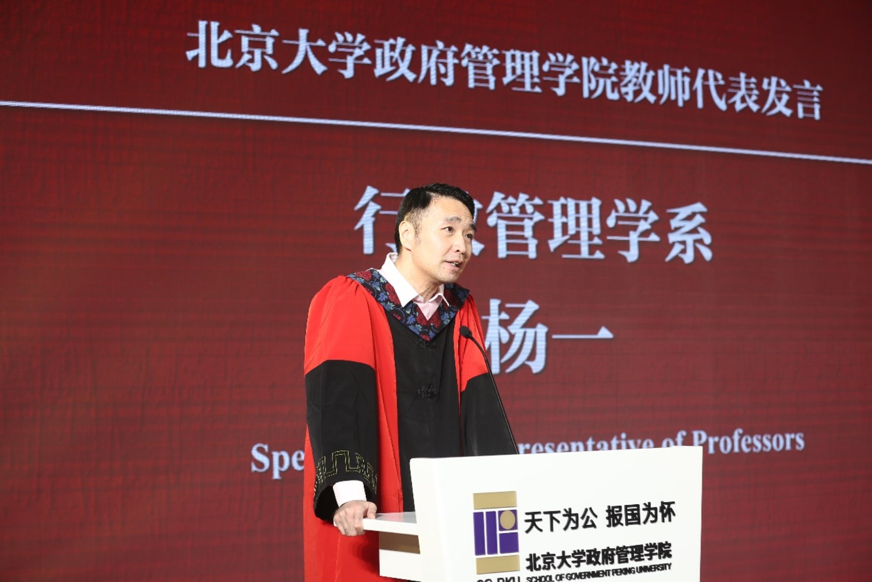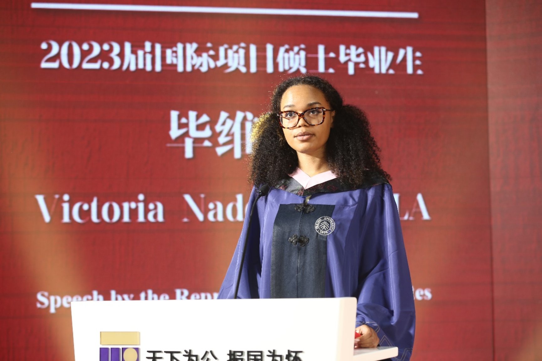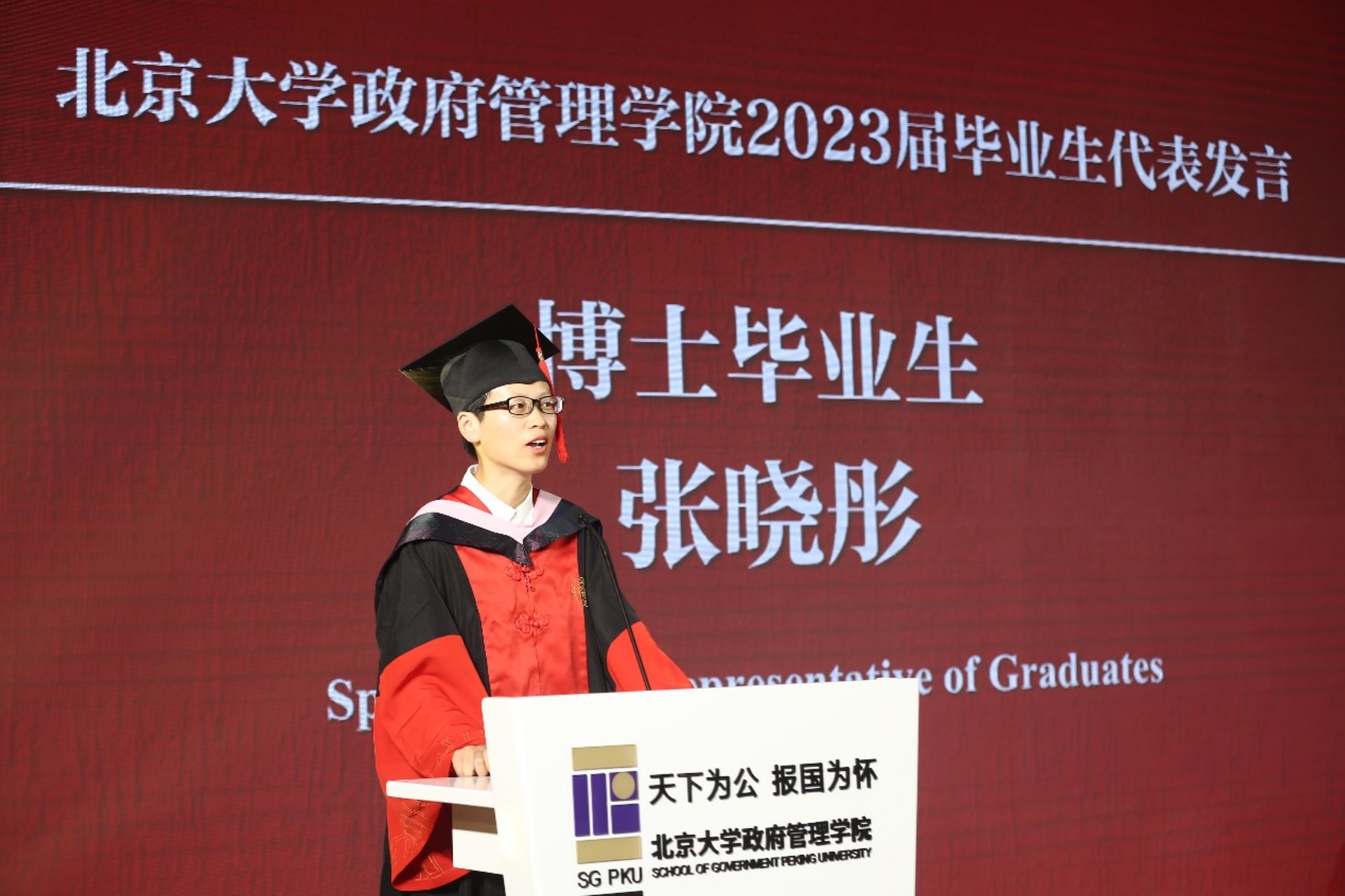 高昕阳、张晓彤、毕维娜(Victoria Nadezhda BELA)三位同学代表毕业生发言。高昕阳在发言中从共同体的概念出发,讲述了自己对于“天下为公,报国为怀”院训的理解,并表达了自己将在更大的共同体中牢记责任使命,贡献政管人力量的决心。张晓彤在发言中,结合自己在政管求学的经历,讲述了自己对于“传承”、“感激”和“将来‘三个词语的理解,在表达对师长感激之情的同时,立志努力传承前辈的学问与人格、继续扎实做事、踏实做人,在发现光、追求光与成为光中迎接未来。来自俄罗斯的国际项目毕业生代表毕维娜在发言中表达了对学院的感谢,表示在学院习得的知识和技能将成为自己受益终身的财富。