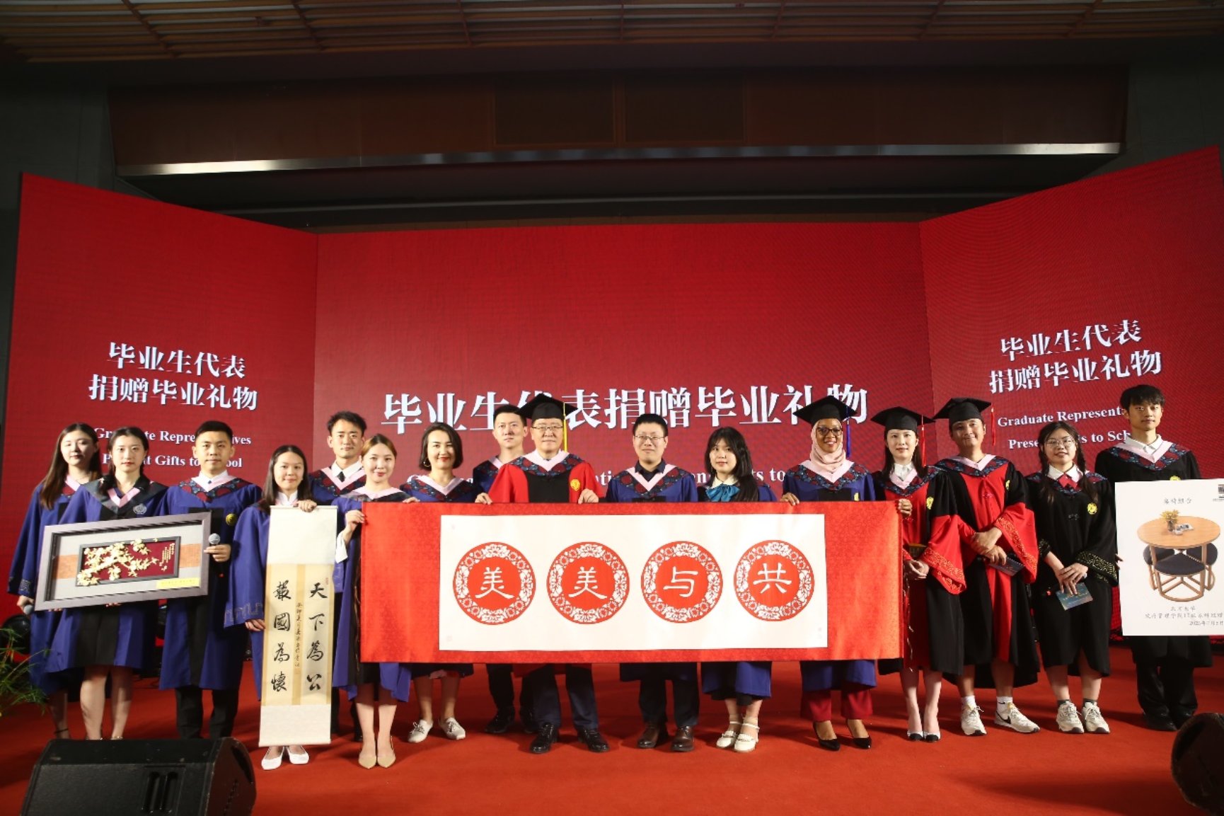 随后,各年级毕业生代表向学院赠送毕业礼物,每一份礼物的背后都饱含着沉甸甸的心意,毕业生代表也逐一分享了礼物的美好寓意。桌椅、书柜等实用物件,绿植、金箔绘画、铜牛、壁挂花篮、剪纸卷轴等手工艺饰品,都承载着毕业生对学院的祝福与感恩。