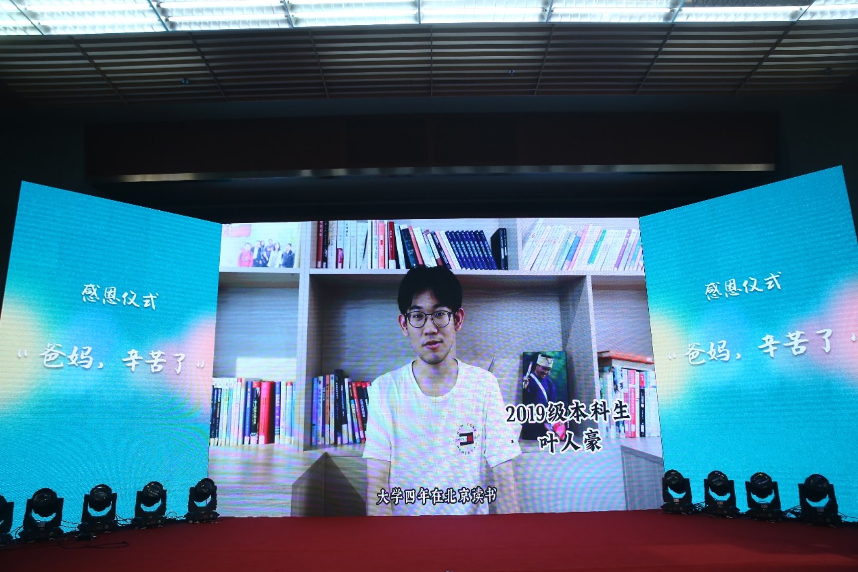 感恩仪式包括 “老师,谢谢您”“爸妈,辛苦了”和“朋友,再会了”三个环节。各年级学生代表朗诵了自己毕业论文致谢中的选段,向传道授业的老师们致以最真挚的敬意和谢意,并向在座的老师们赠送了印有学院老师话语的毕业礼物。接着,师生共同观看了同学们精心录制的感恩视频,学成之际,同学们也纷纷表达了对家人的爱和感谢。在感恩伙伴环节,6位毕业生代表分别讲述了自己与伙伴之间的故事,在悠扬的歌声中,毕业生们为身边的伙伴佩戴院徽,向彼此送上最美好的祝福。