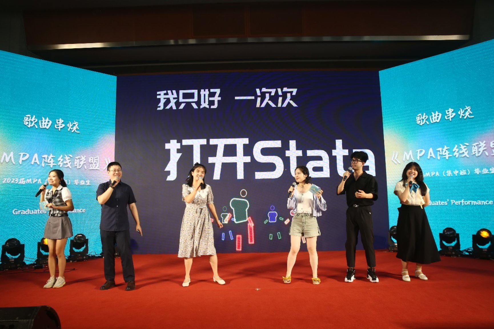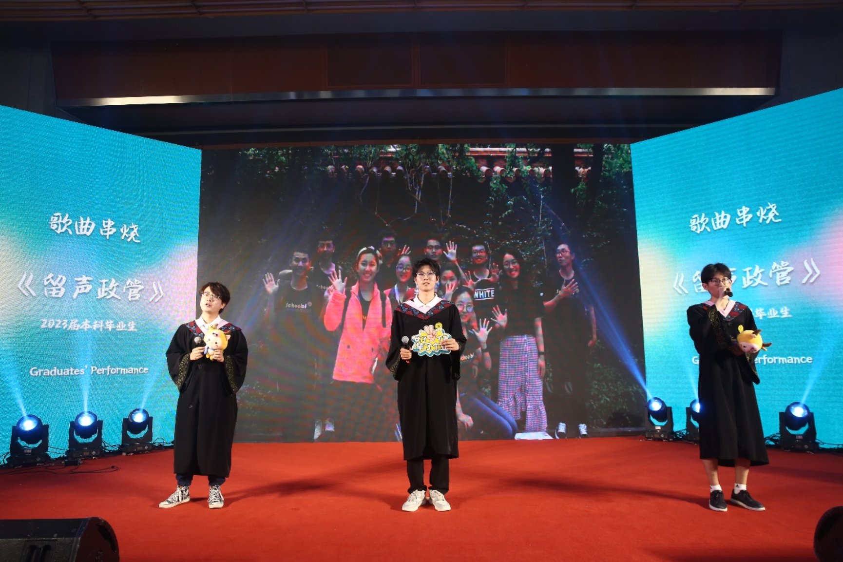 欢送会现场氛围被2023届国际项目毕业生带来的开场舞Let the Great World Spin瞬间点燃。在文艺汇演环节,来自不同毕业班级的同学带来了精心准备的歌舞:2023届国际项目毕业生带来吉他弹唱《The Parting Glass》,律动的音符与空灵的声音诉说着青春的灿烂;2021级硕士班的同学带来歌曲串烧《干杯》,在他们的歌声中有对过去的怀念与未来的期待;2021MPA集中班的同学带来了编排歌曲《MPA阵线联盟》,以诙谐幽默的方式回顾了在政管求学的时光;2021MPA周末班的同学带来了歌舞联排《我们的舞台》,舞台上充满青春活力的舞姿与歌声串联起他们对学校学院、对老师同学无尽的爱;2019级本科班的同学带来了歌曲串烧《留声政管》,带领大家一同回忆了在学院生活的点点滴滴。曼妙的舞姿在脑海中不断重映,动听的歌声在教室里久久回荡。精彩纷呈的节目饱含着同学们对学院的感激与不舍。
