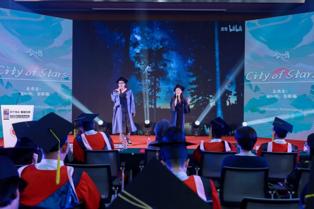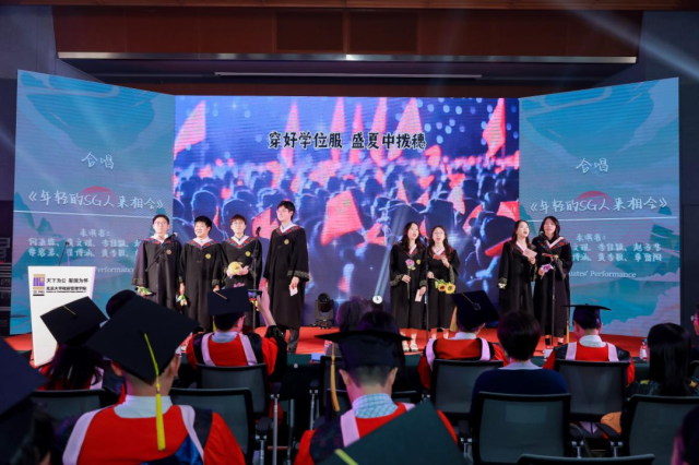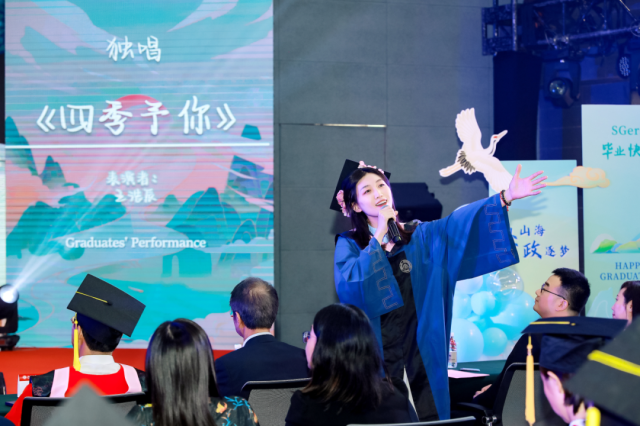 典礼现场气氛在开场舞蹈《Shine Better》中迅速升温。2024届MPA王浩辰一曲独唱《四季予你》深情款款,用悠扬的歌声传递对时光流转的感慨及对毕业生的美好祝福。LSE项目田心怡和委内瑞拉留学生安德瑞合唱《City of Stars》,和谐悦耳的合声不仅展现了跨文化交流的美妙,也表达了对梦想的无限憧憬。2024届本科生班带来的合唱《年轻的SG人来相会》充满青春的活力与激情,号召广大政管毕业生积极投身中国式现代化建设和实现民族复兴的伟大征程,引起了在场毕业生的强烈共鸣,会场多次响起热烈掌声。舞台上的每一个瞬间,都是他们对青春的致敬,对母校和学院的深情告白,以及对美好未来的热切期许。