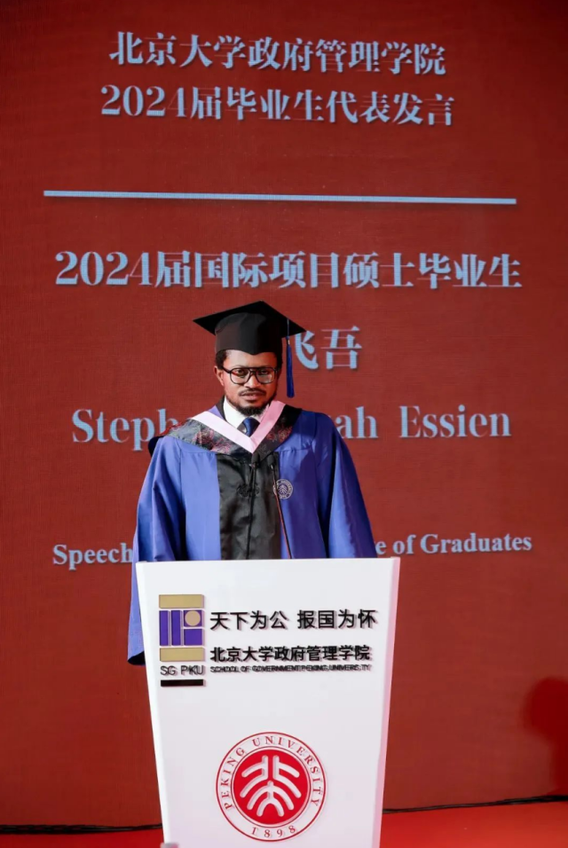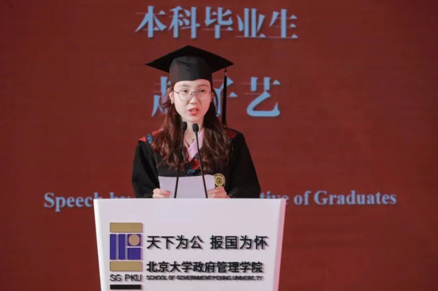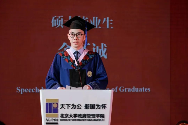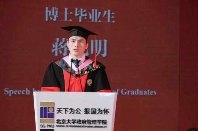 接下来,本科生代表赵子艺、硕士生代表余怀诚、博士生代表蒋光明、国际项目学生代表尹飞吾四位毕业生先后发言。赵子艺回顾了燕园的多彩生活,表达了对老师们的感激之情,以及对未来的祝福与展望。余怀诚作为第一届香港MPA班的代表,讲述了他们通过北大的学习经历,提升了服务市民的能力,对国家走过的艰辛历程和取得的辉煌成就有了更深刻的体会,表达了建设香港、贡献国家的决心。蒋光明分享了博士求学时光里孤单恬淡与团结温暖并存的难忘回忆,还分享了他从学院带走的三样宝贵财富:专业能力、家国情怀和情感联系。尹飞吾表达了在北京大学学习和生活经历对他个人成长的重要性,在中国的时光教会了他韧性、适应性和决心,未来必将珍视这一切宝贵记忆。