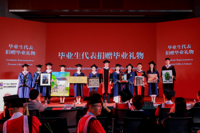 随后,各毕业班级学生代表向学院赠送毕业礼物。2024届本科班同学们以常青绿萝祝愿学院青春常在、师生感情常在。2024届硕士生班送上舒适的躺椅,希望学院师生能在繁忙工作中小憩片刻、仰望星空,让伟大的思想在摇篮中悄然孕育、发扬光大。2024届博士生班用书柜表达了将知识与经验代代相传的美好愿景。2024届MPA新疆班向学院赠送“五星出东方利中国”挂毯,昭显中华文化多元一体、生生不息,也代表着北大政管桃李满疆、春晖四方。2024届MPA集中班赠送了桃李满门摆件,祝愿学院继续繁荣发展,再创辉煌篇章。2024届MPA周末班为学院门外草坪送上一架秋千,祝福全体毕业生在各领域乘风破浪。2024届MPA香港班选择了香港10个有代表性的景色制作照片,欢迎学院师生探索香港丰富多元的文化底蕴。2024届国际项目毕业生向学院赠送“风生水起、龙行天下”工艺摆件,祝福学院师生未来都能取得杰出的成就。会上还介绍了毕业生向政管“云书馆”捐赠数字图书的情况。院长燕继荣代表学院接受毕业生赠礼,并向毕业生同学表达感谢。