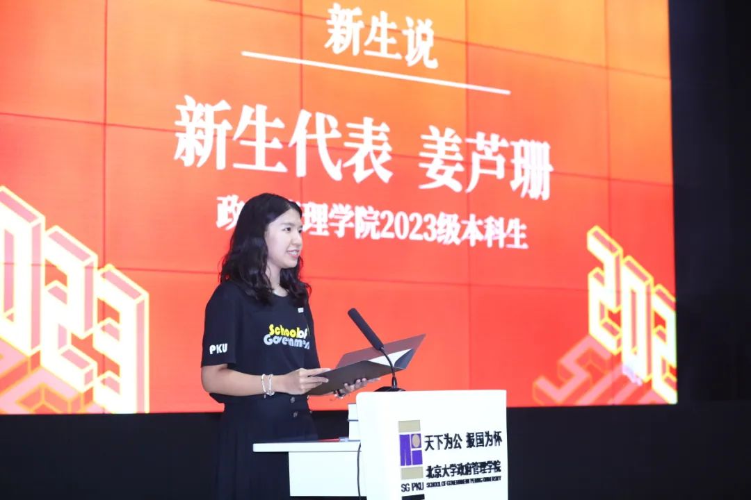 在播放暖心的开场视频后,开学典礼拉开帷幕。2023级本科生姜芦珊作为新生代表发言,她援引燕继荣院长的话语,表达了作为政管新人,立志勇担时代使命,以政治学、公共管理学的视角去关照世界,钻研学问、理性辨别、深刻思索,为国家和世界的发展贡献力量的信念与信心。