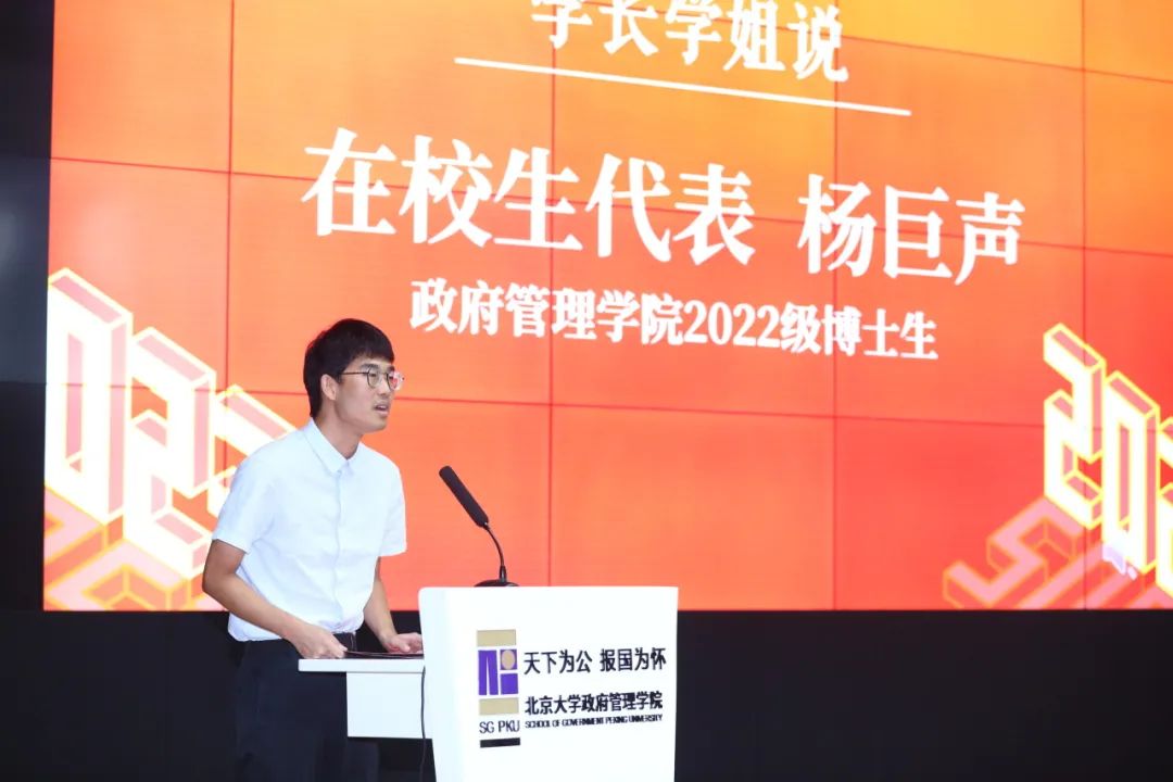 2022级博士生杨巨声作为在校生代表发言。他以“仰卧起坐的年华,也是张力四溢的青春”为引,引导同学们理性看待“内卷”和“躺平”,珍惜在北大求学的时光,在学习成长过程中不断理解和把握理论与现实、时间与空间的关系,兼顾“科学”与“艺术”,既要努力解决现实问题,也要勇敢追求内心的幸福感。