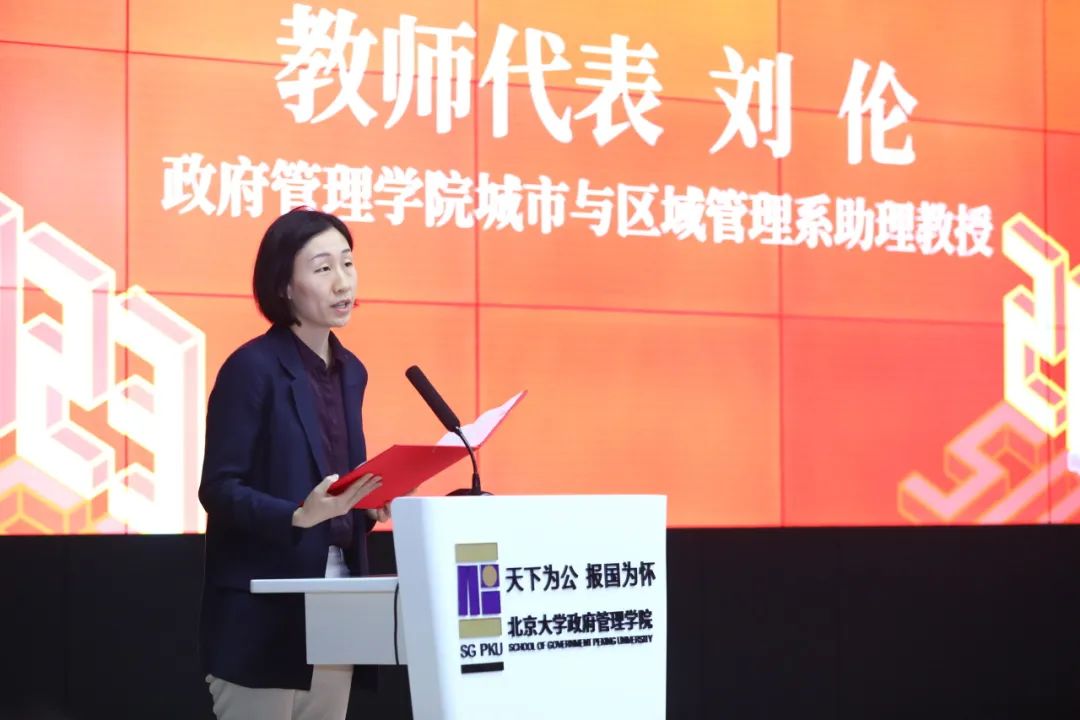 城市与区域管理系助理教授刘伦代表学院教师发言。她围绕如何破除“内卷”,更好地度过在北大、在政管的时光,她鼓励同学们将个人发展与政治学学科特点所带来的使命相结合,参与解决重大时代课题,同时努力发现并追求自己的独特志趣,实现二者辩证统一,成为兼具专注力、勇气和创造力的思考者和行动派。