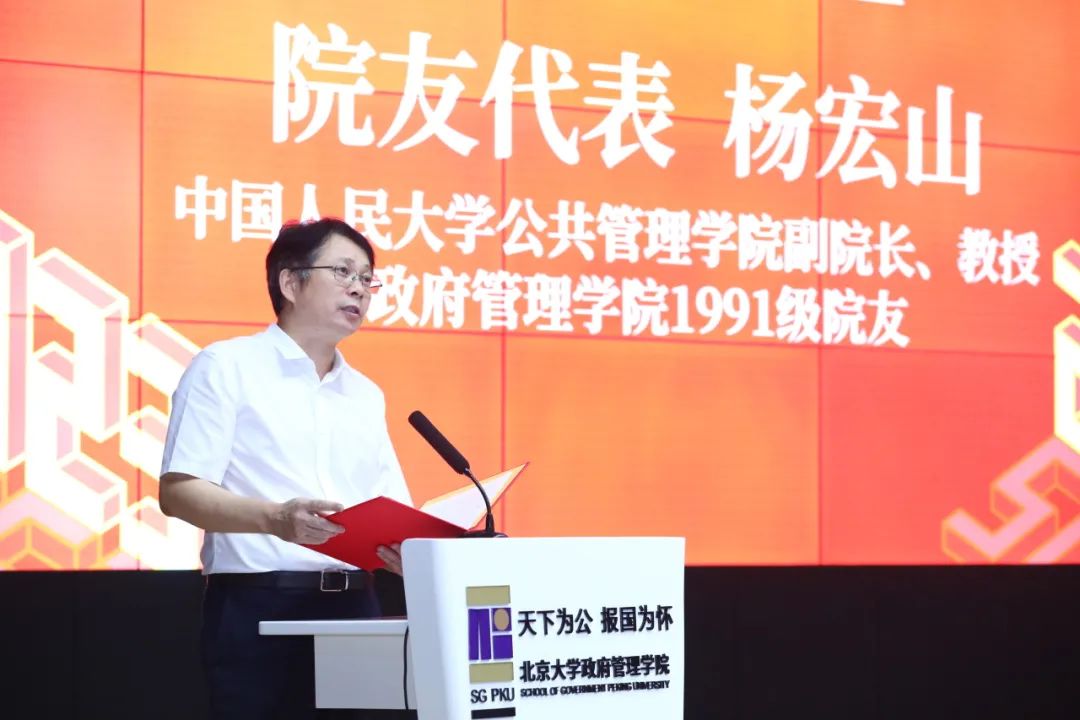 杨宏山教授代表院友发言。他分享了过去的北大经历和人生感悟。他谈到,作为北大人,要追求卓越,志存高远,同时脚踏实地,把握宝贵的学习机会;其次,要多思勤问,尽早确定方向,提前做出规划;最后,他强调了知行兼修的重要性,鼓励同学们将科学知识与情境性知识相结合,积极参与社会实践。