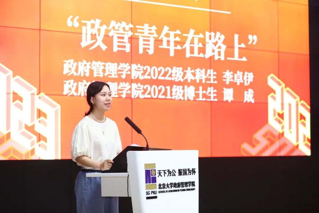 本次开学典礼特别设置了“政管青年在路上”主题分享环节,2022级本科生李卓伊、2021级博士生谭成分享了暑期实习、思政实践的经历和感悟。李卓伊从基层干部的经历与故事中触摸到宏大命题的底层逻辑,并借此抒发了“在知行合一中确立青春坐标”的感悟。谭成结合暑期实习实践活动时洞察社会、感受生活的难忘经历,畅谈对广阔天地与自我之间关系的深度理解,并鼓励同学们为着“良政善治”的美好愿景,怀揣炙热理想,永远行走在奋进的道路上。