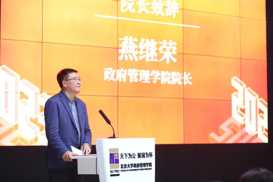 随后,学院院长燕继荣作题为《变革时代等待你们用学智去归置》的致辞。他向所有2023级新同学表示热烈欢迎。他把入学北大的意义比喻为“在头顶设置了一道光环”,希望同学们从现在开始不懈奋斗,成为与北大人、北大政管人身份相称的人,经受住磨练和挑战,在解决难题和激烈竞争中不断成长。他全面介绍了政府管理学院悠久的学科历史和完备的学科建设,他希望同学们珍惜广阔的学术平台,把握“学术与政治”的真谛,以实事求是、客观理性为要旨,用知识和智慧去归置原本无序的现实世界。