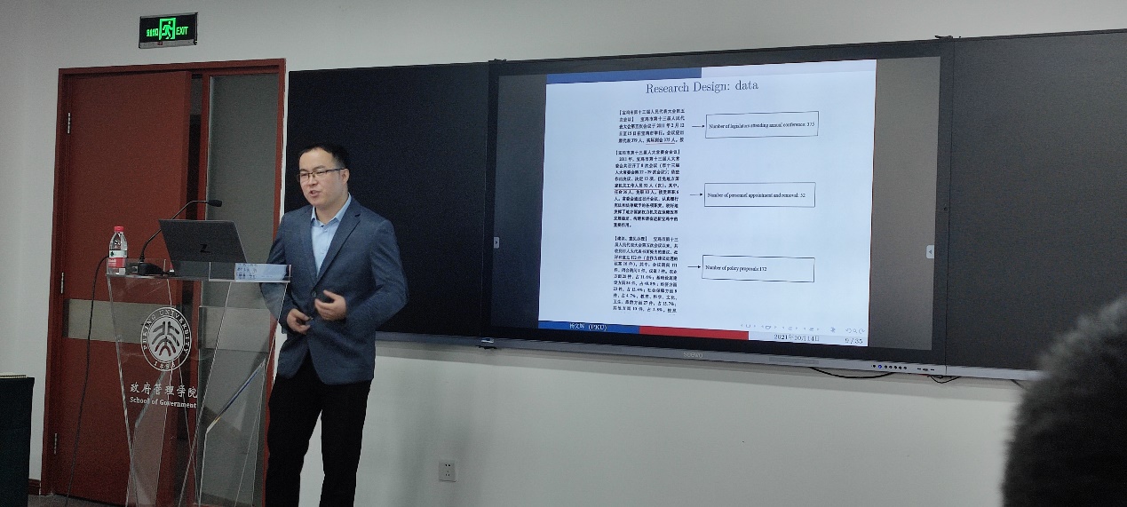 10月14日,政府管理学院在廖凯原楼514教室举办青年学者论文工作坊第七期活动,杨文辉老师围绕主题“权力设置方式与地方人大治理”做了报告。张长东老师主持了本期工作坊,马啸老师担任评议人,燕继荣、封凯栋、杨一、刘颜俊、费海汀、罗祎楠、曾渝、张洪谋、王越端、杨锋(北京大学社会研究中心)等老师,多位在站博士后,以及20多位在读研究生与本科生参加了此次活动。